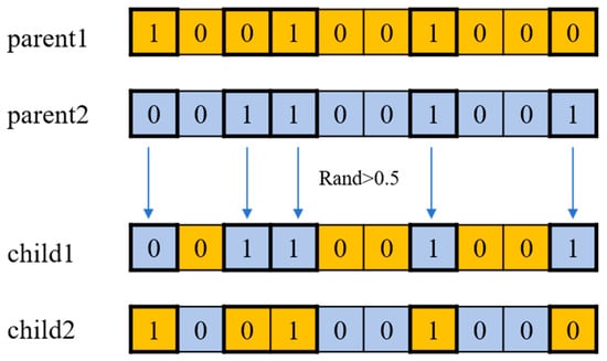 - CrossoverThe algorithm will randomly select two parent individuals from the current population and perform the crossover operation based on these two parents. A preset crossover probability () is used to decide whether to perform the crossover operation. If the execution condition is satisfied, a uniform crossover is performed on the parent individuals. Otherwise, the two parent individuals will be directly copied as offspring individuals. An example of the crossover operation is in Figure 6. For each bit of the individual’s genes (i.e., the selection state of each link), the values of the corresponding bits are exchanged between Parent 1 and Parent 2 with a probability of 0.5 to construct two child individuals.