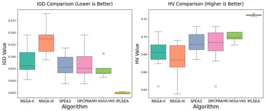 We also provide the computational complexity analysis of the IPLSEA and its comparison algorithms. IPLSEA’s complexity is mainly determined by nondominated sorting, with a single generation being approximately  and the overall complexity being , where  is the population size,  is the number of objectives, and  is the number of iterations. In comparison, the classical NSGA-II and NSGA-III also have the same dominant complexity. NSGA-III adds reference point processing, but the overall complexity remains . SPEA2 calculates the distance matrix between individuals, with a complexity of . DPCPRA adopts a two-population structure, with a complexity approximately twice that of non-dominated sorting, still belonging to the  level. MO-NSGA-VNS introduces a neighborhood search, with a complexity approximately equal to , where the local search overhead  is typically smaller than the non-dominated sorting overhead. Overall, the IPLSEA has comparable complexity to these algorithms, and the addition of a local search helps improve the performance without significantly increasing the computational burden.