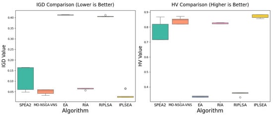 In HV metrics, the IPLSEA maintains its leading position with a mean value of 0.7244, the highest among all compared algorithms, coupled with exceptional stability evidenced by its minimal standard deviation (0.0012). This combination of a high hypervolume and low variability confirms the algorithm’s robust solution quality and reliable performance. The MO-NSGA-VNS and DPCPRA show stable but inferior results. These comprehensive results underscore IPLSEA’s dual advantage in both solution quality and algorithmic stability for multi-objective network optimization challenges.
