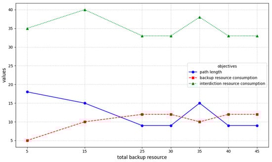 A comprehensive experimental evaluation demonstrates the IPLSEA’s superiority over state-of-the-art competitive algorithms, with a dominant performance in both the IGD and HV metrics. Ablation experiments confirm that both the initial solution generation method and IPLS significantly enhance the algorithm performance, with the IPLS contributing particularly substantial improvements. Sensitivity analysis experiments reveal that increased backup resources yield progressively shorter achievable path lengths until reaching a stabilization threshold, while attacker resource expenditure remains largely independent of backup availability.