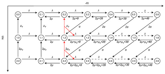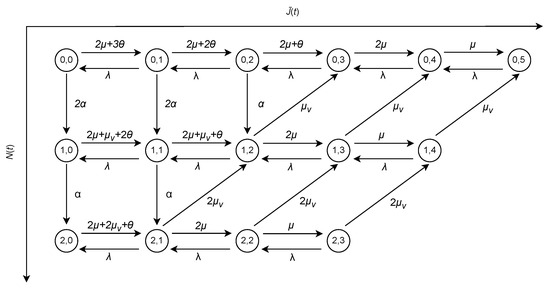 where the block matrices (for 0 ≤ j ≤ K − 1), (for 0 ≤ j ≤ K), and (for 1 ≤ j ≤ K) represent the transitions that increase, preserve, and decrease the level, respectively. The explicit forms of these block matrices are provided in Appendix A. As an illustrative example, Figure 1 shows the state transition diagram for the case where l = 2, v = 2, and K = 5.