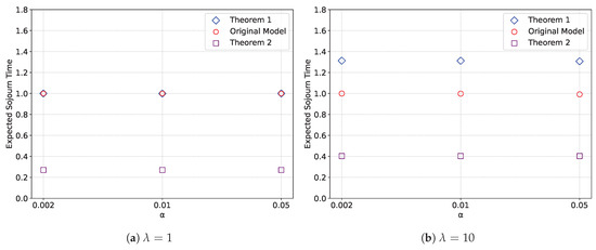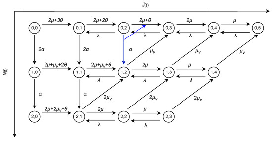 We observe that contains a single irreducible class that exactly coincides with the original state space S. Moreover, the transition rates within this irreducible class are identical to those of the original model on S. This implies that the stationary distribution of , when restricted to this irreducible class, is identical to the stationary distribution π of the original model.