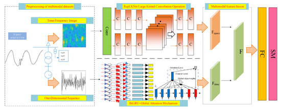 16]. Simultaneously, Vision Transformer (ViT) and its variants have been employed in time–frequency image modeling, significantly improving global feature extraction from images. Furthermore, cross-modal attention mechanisms have shown promising robustness and generalization performance in multimodal data fusion tasks [