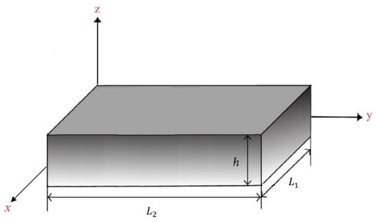 In Figure 1, a rectangular, porous, functionally graded material nanoplate made of three constituents, , , and , with thickness (), length (), and width () is displayed. According to Voigt’s model, the effective properties of BFGP such as mass density ρ and elastic modulus are written where change along the thickness -axis and the length -axis is based on the following equation: