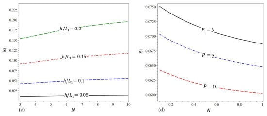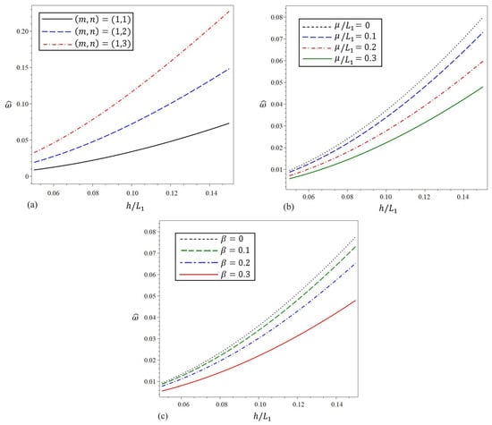 Regardless of the mode, nonlocality, and porosities, Figure 2a–c illustrate that the curves of the frequency increase greatly with increasing the thickness ratio of the plate. Moreover, as seen in Figure 2a, the frequencies increase with the increment of the wave numbers, while frequency values decrease with the increment of the nonlocal parameter (see Figure 2b for more illustration) as well as the porosities, as shown in Figure 2c. It is worth mentioning that rise of the porosity rate and transverse index of the material grading can be led to the reduction of the proposed plate rigidities in the present numerical example (even porosity distribution case), whereas increase in the porosity while neglecting the transverse index of the material grading () can cause an increase in the proposed plate rigidities.