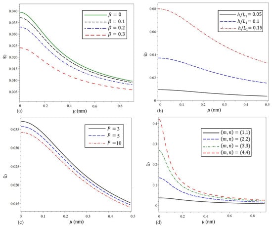Behavior of the frequency curves versus the nonlocality is depicted in Figure 3a–d for some values of the porosity, the plate thickness, the transverse index of power law, and the modes, respectively. In Figure 3a, the parameter represents absence of the porosities in the structure, and the curve corresponding to this value takes the higher value of the frequency among the curves when the nonlocal parameter trends toward an increase. Furthermore, the frequency curves tend to decrease when the nonlocal parameter increases. In the presence of the porosity and transverse index (), values of frequency reduce with increases in the porosities. On the other hand, the frequency depends on the plate thickness, where it is seen from Figure 3b that increasing the thickness ratio leads to an increase in the frequency. Figure 3c displays the effect of the power law transverse index on the vibration frequency of the UPFGP. The same influence on the frequency occurs by increasing the wave number, as seen in Figure 3d. It is noteworthy that the frequency curves tend to decrease when increasing the nonlocality for all four cases regardless of the influence of examined parameters: the porosities, the plate thickness, the power law transverse index, and the wave number.