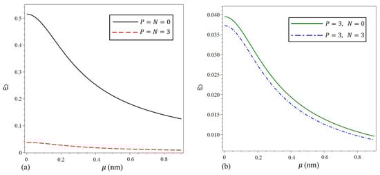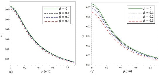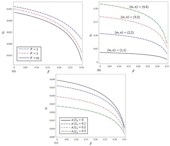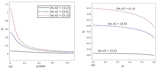Figure 9a,b shows the behavior of the nondimensional frequencies, a variation of the nonlocal parameter, for some cases of the transverse and axial power-law indexes. Figure 9a displays the behavior of the vibration of the BPFG nanoplate in the presence and absence of the grading indexes. It can be observed that the frequency decreases transverse and axial power-law indexes. The frequency value of the model in the absence of both gradient indexes is higher than the frequency of the bidirectional functionally graded nanoplate. Moreover, it is seen that the frequency decreases with the increasing nonlocal parameter in both cases, but the frequency curve in the absence of the gradient indexes decreases sharply compared to the frequency curve of the bidirectional functionally graded nanoplate. A comparison of the nondimensional frequency behavior of the model with the transverse power-law index () with the frequency of the system with both gradient indexes (bidirectional functionally graded nanoplate) is displayed in Figure 9b. It is noted that the frequencies behave the same in both cases, where the frequency curves tend to reduce when increasing the nonlocality, but the value of the frequencies for the unidirectional functionally graded nanoplate () is higher than the frequency values of the bidirectional functionally graded nanoplate.