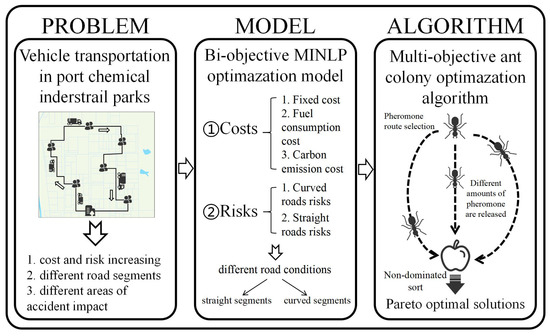 Overall, the aforementioned studies have made different contributions to risk research in hazmat transportation, yet several critical issues remain unresolved. Specifically, current risk assessments primarily focus on conventional road networks (highways, railways), neglecting targeted analysis for the scenarios of port chemical industrial parks. Moreover, scholars have studied the risk of vehicles driving on different roads, such as curves and intersections, but have overlooked the comprehensive consideration of the risk of hazmat transportation on straight roads and horizontal curved roads. In addition, due to its proven effectiveness in solving VRP with multiple constraints, rapid convergence, and flexibility in adapting to different problem structures, the ACO algorithm is chosen as the base optimization framework in this study. However, existing ACO-based approaches for hazardous materials transportation often assume simplified or homogeneous road geometries, overlooking the distinctive safety implications of complex geometric conditions.