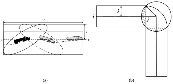 Given the inevitability of lane-changing maneuvers, a vehicle’s transportation trajectory is never a straight line. Therefore, there are multiple possibilities for vehicles’ motion patterns on straight segments, and the influence district is approximated as a rectangle in this study, shown in Figure 2a. Therefore, the exposure area of the straight road is obtained as