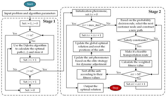 Currently, the solution methods for VRP are mainly divided into exact algorithms and heuristic algorithms. However, the proposed HVRP-DRC model, which involves a large number of complex constraints, poses significant challenges for the application of exact algorithms. In contrast, heuristic algorithms, such as the ACO algorithm and Particle Swarm Optimization (PSO) algorithm, stand out due to their simplicity and fast convergence speed. Therefore, this study adopts the ACO algorithm to solve the proposed model. Algorithm 1 shows the pseudo-code of the ACO algorithm.