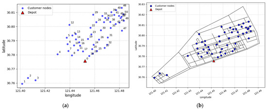 Assume that there is a port chemical industrial park, and assume that there is a type of liquid hazmat to be delivered to 50 enterprises daily. The parameters on vehicle transportation and the park are collected from safety experts and truck drivers and are listed in Table 2. Assume that there are 50 enterprises (customer nodes) that require transportation services. All the enterprises, as well as all the endpoints of the available road sections in the introduced park, are numbered, following a top-to-bottom and left-to-right order. Specifically, the locations of the customer nodes are depicted in Figure 4a, while the park’s road network is illustrated in Figure 4b.