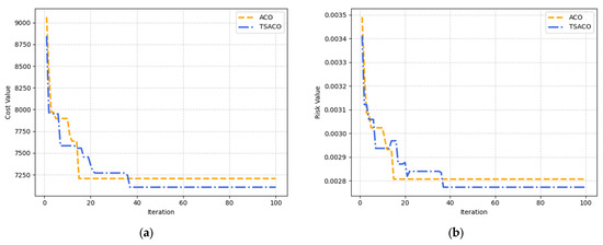 (a) Total cost value for each iteration; (b) Total risk value for each iteration.