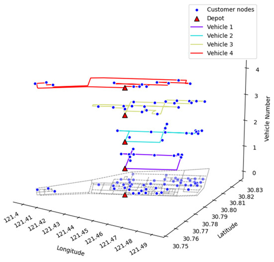 To obtain a hazmat transportation method that optimally balances both transport risk and cost in actual life, this study employs the TSACO algorithm to conduct a numerical experiment on the proposed model for a port chemical industrial park. The algorithm is executed randomly ten times, with each run generating an optimal solution. Meanwhile, a classical ACO algorithm is employed to optimize vehicle routing for customer node service. After ten independent runs, the optimal solutions from both algorithms were selected for comparison. Figure 5 presents the comparative results of objective function values between the ACO and TSACO algorithms when reaching the maximum iteration limit. Table 3 presents the detailed calculation results obtained by using the two aforementioned algorithms. The vehicle routes obtained by using the TSACO algorithm are shown in Figure 6, and the detailed path information is presented in Table 4.