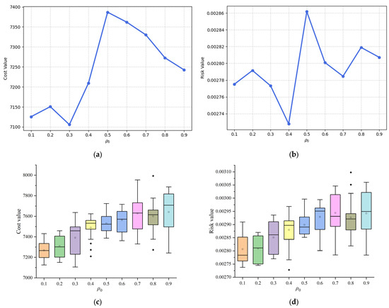 Moreover, for each set value , set the execution times to 10. After eliminating the outliers or abnormal calculation results, nine boxpoints are obtained to describe the optimal cost values, and nine represent optimal risk values. More details are shown in Figure 7c,d. It is noteworthy that the highest point at the end of each vertical box represents the maximum optimized value for each obtained from 10 calculations (after excluding outliers). Similarly, the lowest point at the end of each vertical box represents the minimum values. The boxplots in Figure 7c,d demonstrate superior overall performance at lower values (particularly 0.1–0.3). As the parameter increases, the quality of the calculation results gradually deteriorates. Therefore, preventing extreme pheromone accumulation while maintaining stable performance is recommended as the optimal configuration. In general, the regulations derived from Figure 7c–d are consistent with those from Figure 7a,b, which verifies the validity of the sensitivity analysis.