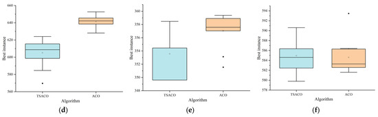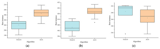 This study conducted comparative validation between the proposed TSACO algorithm and the conventional one, with detailed solution results for different instances presented in Table 5. In particular, since there is no pathway information between each customer node in the adopted instances, the distance between each node is calculated by using Euclidean distances. For clarity, Figure 8 presents the box plots for instances C101-25, C101-50, R101-25, R101-50, RC101-25, and RC101-50.
