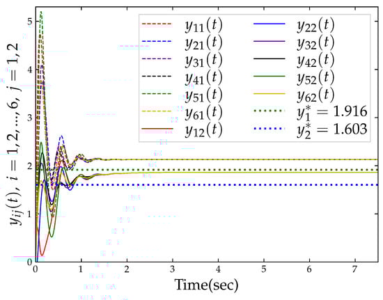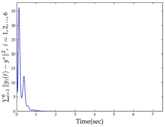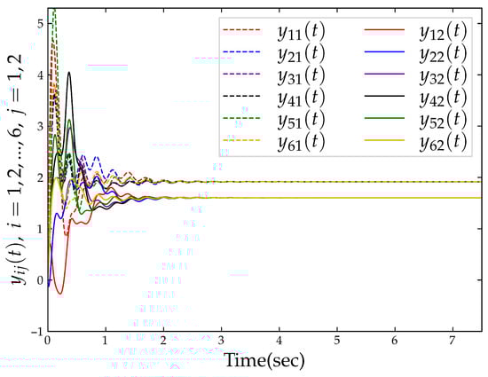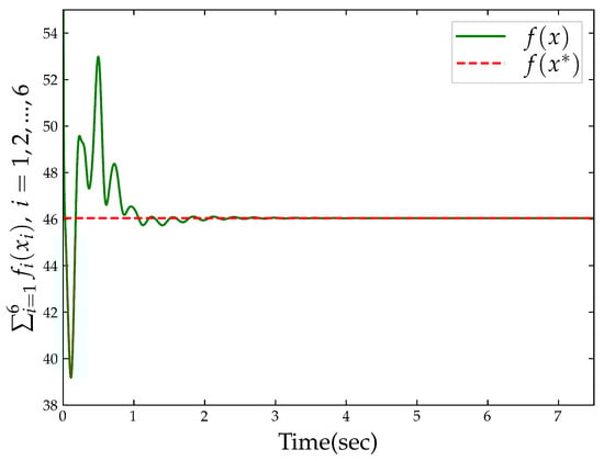 First, the optimal control output corresponding to the optimization problem is determined by other efficient gradient algorithms to verify the effectiveness of Equation (5). The variables , , , and are randomly initialized with parameter settings , , , , , , and and a step size of 0.001. Figure 2 and Figure 3 demonstrate that both components of the outputs of all six agents converge asymptotically to and , respectively. The evolution of the global cost function is shown in Figure 4, confirming convergence to the optimal value , where denotes the exact optimal solution of Problem (2). Figure 5 presents the adaptive coupling gains , which converge to positive constants. Therefore, the obtained results validate the effectiveness of the proposed algorithm in solving Problem (2) over unbalanced digraphs.