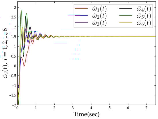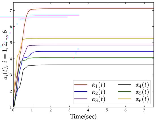 Meanwhile, the trajectories of the estimated parameters for each agent over time are depicted in Figure 6, illustrating that eventually converges to the true unknown parameter for . Consequently, the proposed algorithm is capable of addressing DOPs for control systems with unknown parameters.