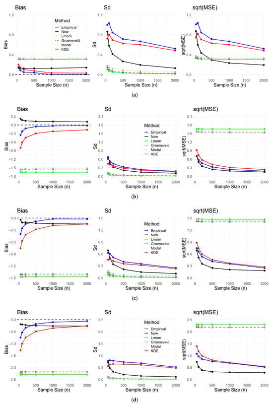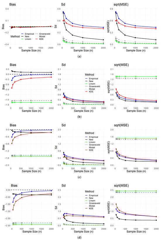Regarding the skewness results in Figure 3, we can see that for the t-distribution, the New estimator now begins to outperform all existing methods from  onward, achieving the lowest MSE. This pattern can be explained as follows: When the sample size is small, the influence of the asymmetric component (5% of  distribution) is minimal, and the dataset from the mixture distribution remains approximately symmetric. As the sample size increases, however, the contribution of the gamma component becomes more substantial, gradually introducing asymmetry into the data. As a result, the proposed method increasingly performs better in capturing this skewness. For the other distributions, the New estimator consistently performs best across all sample sizes thanks to its ability to perform bias correction, similar to our first simulation study.