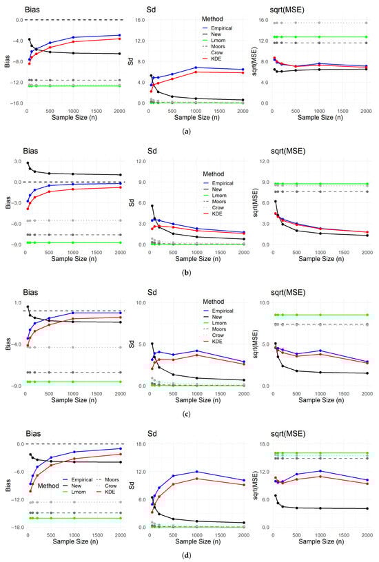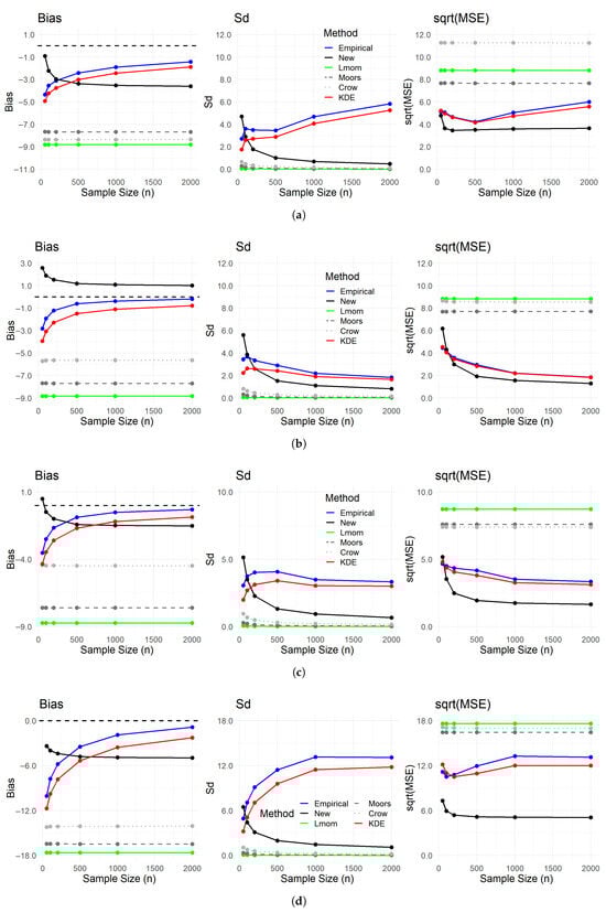 The distributions included in the first numerical study are t, gamma, log-normal, and Generalized Pareto Distribution (GPD), as shown in Table 1. The parameters of each distribution were determined considering the purpose of the experiment and the characteristics of the data; see Appendix A for the density functions and parameterizations of these distributions. In particular, for the t-distribution, the mean and standard deviation were selected based on the summary statistics of log-returns from the S&P 500 annual frequency data []. This choice was made to reflect the characteristics of real-world financial data. For the other distributions, parameter values from previous studies were referenced while also ensuring that various probabilistic characteristics, such as asymmetry and tail heaviness, were appropriately represented. We gradually increased the sample size with . For each sample size, the experiment was repeated 1000 times to compare the results using bias, standard deviation, and the squared root of the mean squared error (MSE).