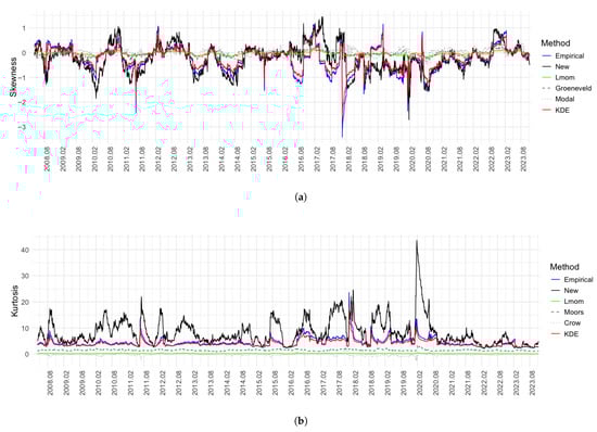 where  denotes the closing price on day t. To examine the distributional characteristics of returns over time, at each time point, skewness and kurtosis are estimated using the methods described earlier with a rolling ±50-day window. This allows us to track the temporal dynamics of distributional asymmetry and tail behavior. The results are presented in Figure 5; for the results of the other estimators are in Supplementary Materials.