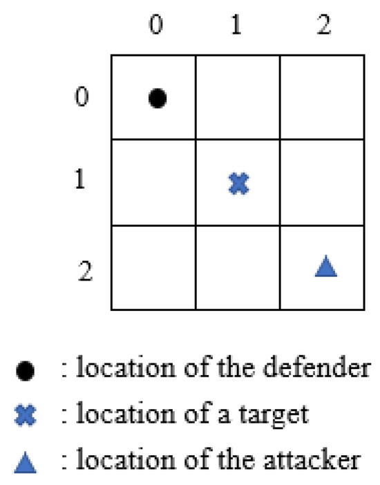 In state t, the state is represented as . If the defender chooses to go “Down” and the attacker chooses to go “Left”, the state will become . A game will end when it enters an “absorbing” state. The “absorbing” state will be achieved if the attacker successfully attacks the target or the defender and the attacker are located in a same grid. In repeated stochastic security games, we consider five different attacker types, which together represent the majority of typical attacking models [5]. The attacker types are as follows: