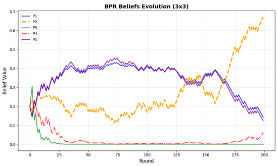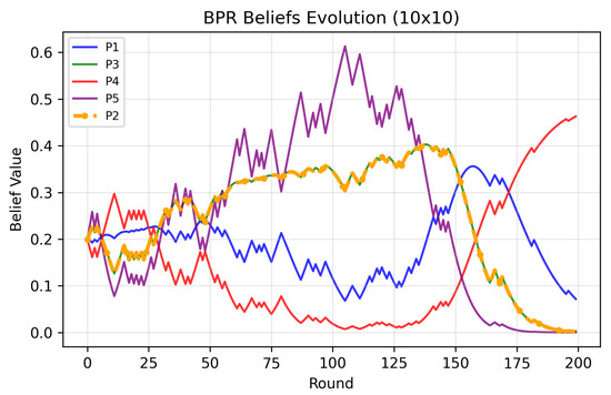 We run the Algorithm 2 in a 200-round security game. Figure 2 and Figure 3 show the belief evolution in a 3 × 3 grid world and 10 × 10 grid. In Figure 2, the beliefs of (P3) and (P4) are at a lower level and those of (P1) and (P5) are at a higher level. This means that the BPR-MINLP algorithm believes that the attacker type is (P1) or (P5) with a higher probability. In (P1) and (P5), the attacker strategies are all mixed. In a 3 × 3 grid with only nine states, these two types are similar. When the attacker behavior changes into another one in stage 125, (P2) becomes the dominant type. In Figure 3, we set the negative value of the defender’s reward as a punishment for the attacker. The maximin strategy is the same as the SSE strategy. The trajectories of (P2) and (P3) coincide. When the attacker type changes from (P5) to (P4), we can see that the algorithm can also detect the changes and identify the true attacker type.