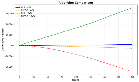 The two solid lines in Figure 4 show the cumulative rewards in a 3 × 3 grid and 10 × 10 grid, respectively. We can see that the cumulative reward in the 10 × 10 grid increases faster than that of a game in 3 × 3. The state set of the 10 × 10 grid is much larger and the Algorithm 2 could better perform in a more complex environment. To verify the effectiveness of the BPR algorithm in our game setting, we compare it with the EXP3-S algorithm [21]. The cumulative rewards using the EXP3-S algorithm in a 3 × 3 grid world and 10 × 10 grid world are represented by the two dashed lines in Figure 4. We can see that the EXP3-S algorithm in the 3 × 3 grid world has poor performance and the cumulative reward is nearly −2500. The EXP3-S algorithm in the 10 × 10 grid world has the worst performance and the cumulative reward is smaller than −20,000. The results show that the Algorithm 2 outperforms the EXP3-S algorithm in improving the defender’s utility. The belief update mechanism of the BPR algorithm could adapt to a changing environment and accurately detect the changes of the attacker’s behavior. The EXP3-S algorithm makes wrong decisions in a complex environment.