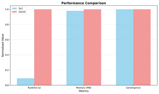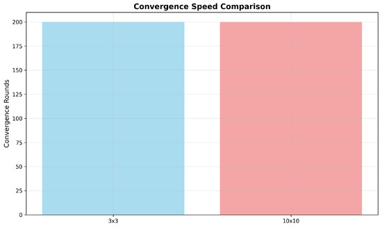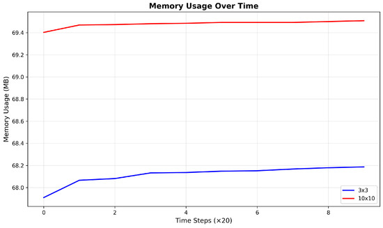 Figure 5, Figure 6 and Figure 7 show the comparison results of the system performance in a 3 × 3 grid and 10 × 10 grid. We can see that the runtime after normalizing 3 × 3 is nearly 0.05 and nearly 1.0 for 10 × 10. This fits our expectation that the complexity is proportional to the running time. In Figure 6, we can see that the memory usage of 3 × 3 remains stable at 68.2. And the value of 10 × 10 remains stable at 69.4. The games in the two grid worlds all converge within 200 rounds. This shows that the algorithm has good convergence and is not significantly affected by grid size.