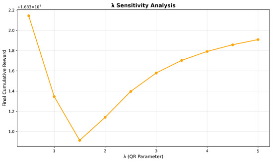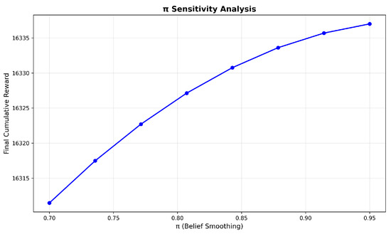 Figure 8 and Figure 9 show the sensitivity analysis results of parameters and in the QR behavior model. In Figure 8, we can see that the cumulative reward increases with the increase in . This means that a higher belief parameter helps the algorithm better adapt to the environmental change. In our game setting, it is better that the value of should be set within the range of 0.85 to 0.95. Figure 9 shows the trend of cumulative reward with the variation in parameter . Parameter quantifies the degree of rationality, where higher values indicate greater levels of rational decision-making. When increases from 0 to 1.5, we can see that the cumulative reward of the defender decreases. in this range means the attacker has a lower level of rationality. There is a significant degree of blindness when reasoning their strategy. The defender may highly utilize known strategies and be trapped in an inefficient equilibrium solution. If is not less than 1.5, the behavior of attacker with higher rationality is much easier to infer. The defender’s cumulative reward will increase.