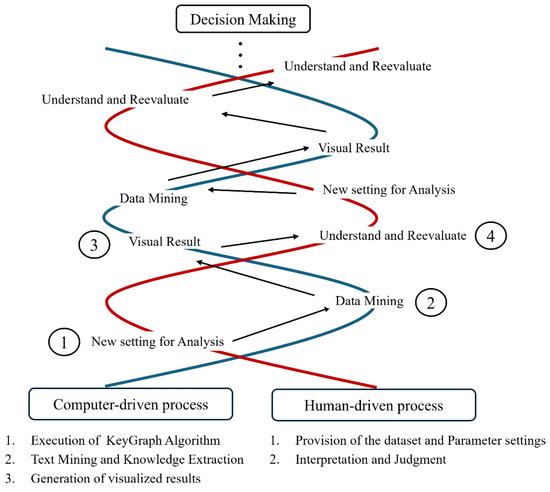 This study adopts the theory of chance discovery as its theoretical foundation and applies its core framework, the double helix model, to perform semantic network analysis and topic detection through an HCI process. The model comprises two interwoven components: the computer-driven process and the human-driven process. Together, they form a spiral cognitive feedback mechanism analogous to the structure of DNA [24,34,35,40,41,42]. This approach captures the dynamic interplay between data-driven analysis and knowledge interpretation, thereby enabling the identification of low-frequency but semantically significant nodes, referred to as “chances” within the keyword network.