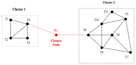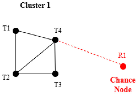 In terms of technical implementation, the KeyGraph algorithm produces a graph structure by analyzing co-occurrence relationships between keywords, where nodes represent keywords and edges indicate the strength of these co-occurrences. As depicted in Figure 2, the concepts of black and red nodes are further introduced to describe this structure precisely. Black nodes represent high-frequency keywords with strong connections to fundamental concepts. These nodes are responsible for the interpretability of the knowledge structure, serving as the backbone of the knowledge graph and the foundational structure of KeyGraph. Typically, multiple black nodes form clusters that contain latent topics embedded in the articles. Red nodes are keywords with lower frequencies but strong co-occurrence relationships with multiple clusters. They are often metaphorically associated with chance discovery, reflecting atypical yet potentially valuable keywords in articles, called chance nodes in this work. Black edges represent strong co-occurrence relationships between black nodes, forming stable keyword clusters via their connections. Red edges denote bridging relationships between red nodes and clusters, highlighting the value of rare events [10,46,47].