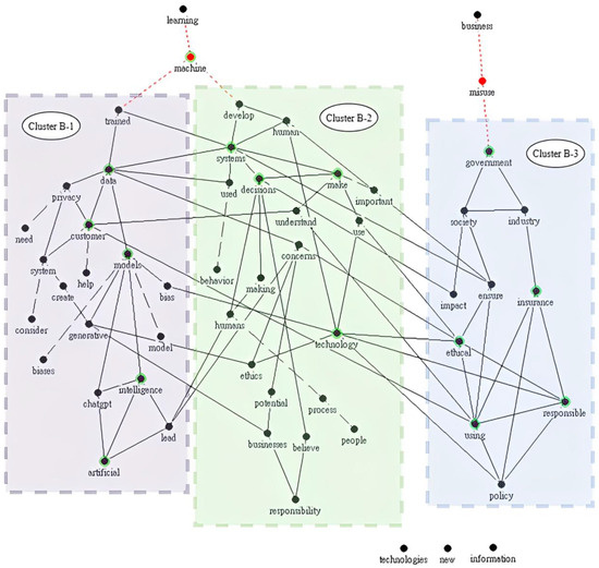 In the practical implementation, this study preprocessed the articles, including word segmentation and stop word removal, and segmented them according to the time series from 2022 to 2024 to observe changes and shifts in potential topics or issues over time. The Polaris visualization tool was employed in combination with statistical methods (e.g., word frequency and co-occurrence analysis) and data mining techniques to execute the KeyGraph algorithm [61], which automatically calculated the keyword co-occurrence frequency and co-occurrence strength. This tool constructs a keyword network graph to explore keyword structures at various levels, promoting semantic interpretation and chance discovery. In the network, high-frequency black nodes represent keywords with a high frequency and stable semantic cores, whereas red nodes represent potential keywords with lower frequency but strong connections to multiple topic clusters. Black edges between nodes reflect the co-occurrence strength between keywords.