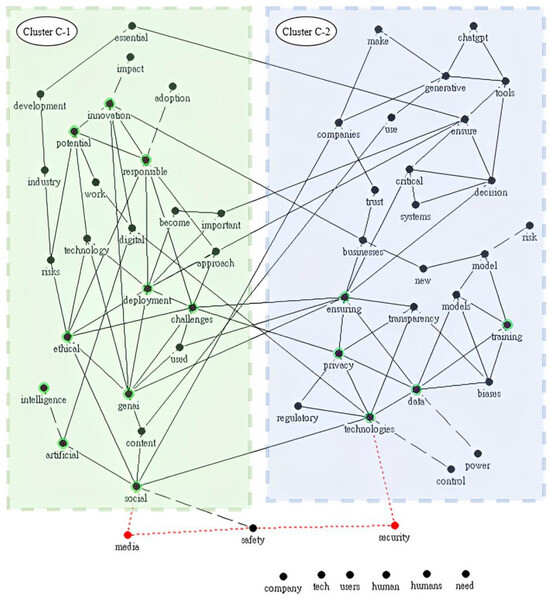 The methodological framework adopted here is comparable to the hybrid semantic analysis model proposed by Chechkin et al. [19], which addresses cybersecurity text analytics by integrating a Knowledge-Associated Network (KAN) for domain-specific feature extraction, a BiLSTM module for capturing sequential dependencies, a Transformer encoder for modeling global semantic relationships, and a Multi-Domain Dynamic Attention Network (MD-DAN) to adaptively weight features from different sources. This architecture enables the model to combine local context sensitivity with cross-domain semantic generalization, achieving high performance in identifying and classifying complex semantic patterns in cybersecurity data. While the domain focus differs—with their study centered on cybersecurity and ours on AI ethics discourse—both approaches share the aim of enhancing semantic analysis through the integration of complementary computational methods. In contrast to their use of deep neural architectures for direct text classification, our method combines the structured keyword-network modeling capabilities of KeyGraph with the semantic reasoning capacity of ChatGPT. Together with iterative human–AI interaction, this facilitates the dynamic discovery and interpretation of cross-text topics and supports the identification of latent and emerging issues in longitudinal AI ethics reports.