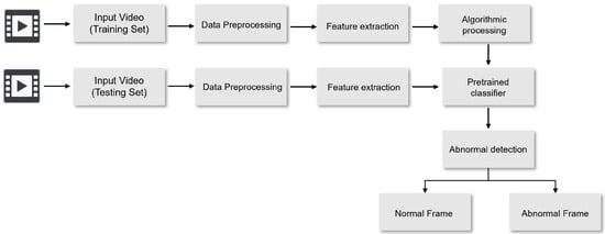 The video anomaly detection (VAD) task refers to the detection of abnormal events in video sequences that are inconsistent with normal behavior or scenes [7], such as traffic accidents, violent behavior, and intrusion events. The processing flow of VAD is shown in Figure 1. During this process, the data collected by the visual sensors in the environment are monitored. The raw visual data are then preprocessed and features extracted [8], and the resulting data are provided to the modeling algorithm to model the behavior of the surveillance target and determine whether the behavior is abnormal. Then, local or global feature descriptors, such as single-class support vector machine (SVM) [9], sparse coding [10], and optical flow map [11], are extracted, and finally. a classifier or cluster is used to determine whether the video frame or segment is abnormal. The disadvantage of these methods is that the feature extraction process is based on manual design and has limited feature expression capabilities, making it difficult to adapt to complex and changeable video scenes.