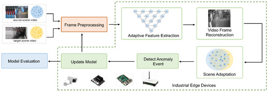 To address the above challenges, this paper proposes an edge intelligence-equipped adaptive industrial video anomaly detection (VAD) method, which mainly includes a preprocessing module, feature extractor, anomaly detector, scene adaptation module, and model evaluation module. For the first challenge, we propose a lightweight feature adaptation method to reduce detection latency by reducing the amount of network parameters, and provide a variety of pruning architectures to adapt to different video scenarios. For the second challenge, we use domain adaptation technology to perform cross-scenario migration anomaly detection to cope with the complex challenges of industrial monitoring scene changes and realize the adaptation of data resources. In addition, we also design a multidimensional evaluation detection model selection method, selecting the appropriate architecture from a series of pruning models for deployment and detection according to the model running environment. In summary, our main contributions are as follows: