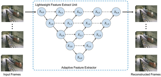 Inspired by Unet++ proposed by Zhou et al. [28], we propose an adaptive video feature extraction algorithm, which uses a multi-level structure to enable the feature extractor to extract and utilize video frame feature information from multiple levels to adapt to complex video scenes, as shown in Figure 4. The lightweight feature extraction unit adopts a dense connection structure so that each layer is connected to other layers to adapt to video frames in different scenes and sizes. For each feature extraction unit, its calculation structure is as follows: