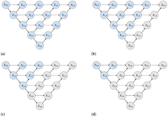Different pruned models for adaptive feature extractor output. Blue nodes represent activated network units involved in real-time inference calculations of the model, used for feature extraction and anomaly detection in industrial scenarios; gray nodes are units pruned and deactivated to adapt to edge devices for lightweighting, which can reduce the amount of computation. Besides, (a) is the unpruned fully-activated basic model, and (b–d) are the processes of progressively streamlining the structure through pruning strategies according to the edge-adaptation requirements of industrial scenarios, reflecting the evolution of the model towards lightweighting and balancing detection accuracy with the resource limitations of edge devices.