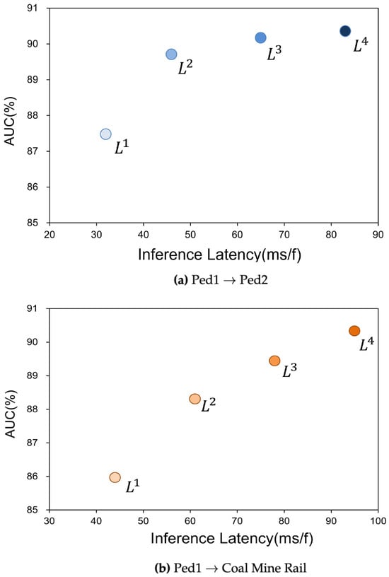 In addition, to verify the adaptive video feature extraction algorithm, we tested the adaptive video feature extraction algorithm on the Jetson using Ped1 as the source scene, Ped2 and coal mine rail monitoring as the target scene, and tested L Model pruning results at four different levels: , , , and . As shown in Figure 8, when the target scene is Ped2, the video scene is relatively simple, and the detection accuracy at the three pruning levels of , and is not very different. Therefore, when low-latency detection requirements are high, the level or pruning model can be used to reduce detection latency while ensuring detection accuracy. When the target scene is the coal mine rail, because the video scene is more complex, the deeper the network, the better the perception and feature extraction of the video frame details, and the better the anomaly detection effect. At this time, the unpruned model is selected at the level for detection. In summary, the adaptive video feature extraction algorithm provides a variety of architecture options, so reasonable measures and choices can be made in terms of detection accuracy and delay.