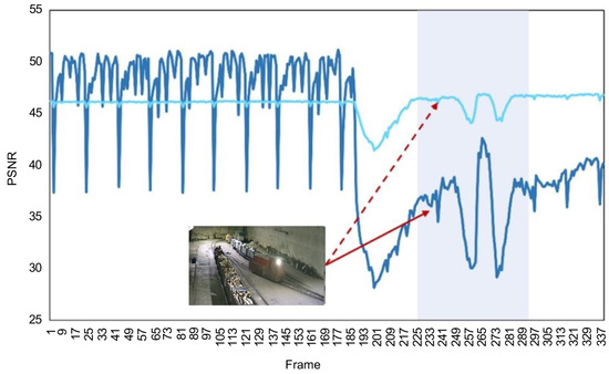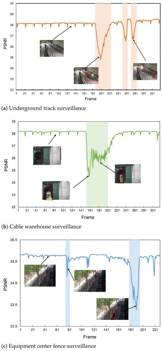 PSNR for anomaly detection in surveillance videos of different coal mine scenes. The vertical axis represents PSNR, which reflects frame quality; abnormal scenarios are often accompanied by a significant decrease in PSNR. The horizontal axis corresponds to the time axis of the video frame sequence. The red boxes embedded in the video frames indicate abnormal targets (such as personnel or equipment). For example, in the underground track scenario (a), the orange curve shows stable PSNR under normal conditions, but the shaded area experiences a sudden drop due to abnormalities (such as equipment failure or unauthorized personnel entry), with the small figure’s red box marking the abnormal area; (b) In the cable warehouse scene (green curve), PSNR decreases during anomalies, with the small figure showing intrusive equipment; (c) In the equipment center fence scene (blue curve), PSNR decreases during anomalies, with the small figure indicating personnel scaling the fence, demonstrating that PSNR anomalies are correlated with actual anomalies.