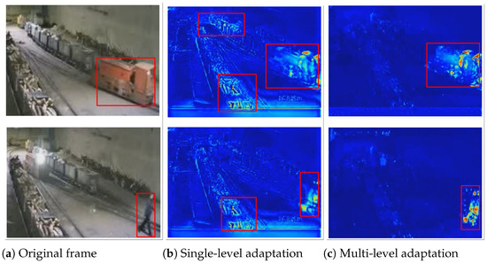 Furthermore, we compare the single-level and multi-level adaptive video frame reconstruction results based on an actual industrial scenario of underground track monitoring. Figure 11 shows the heat map of video frame reconstruction, in which abnormal events (abnormal intrusion of transport vehicles and workers) are shown in the red box. From the heat map, it can be seen that for the same abnormal frame, multi-level feature reconstruction is used. The reconstruction results using only a single level of adaptation also highlight the abnormal parts, while the normal parts are darker. Therefore, using multi-level adaptation can enhance the contrast between abnormal and normal parts, thereby better distinguishing abnormal events.