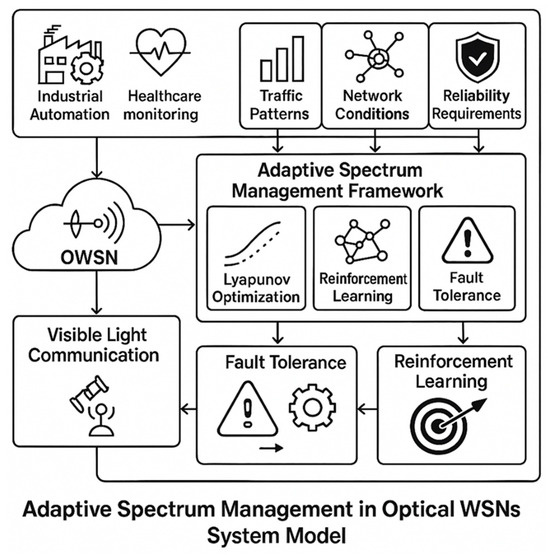 optical wireless sensor networks; adaptive spectrum management; real-time communication; fault tolerance; reinforcement learning; Lyapunov optimization; visible light communication; network reliability; quality-of-service guarantees; constrained Markov decision processes MSC: