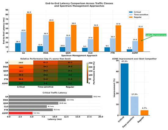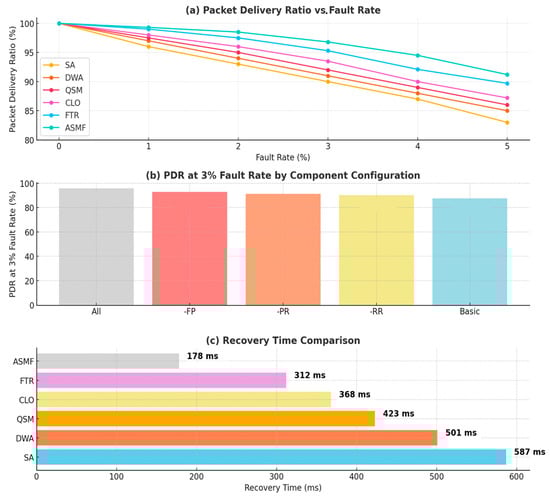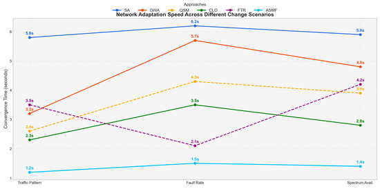 Figure 8 shows the adaptation speed in response to network condition changes. ASMF demonstrated significantly faster adaptation, converging within 1.2–1.5 s compared with 2.1–6.4 s for benchmark approaches. Table 12 demonstrates that the ASMF approach achieves the fastest convergence time after network changes, outperforming all other methods across various traffic patterns, fault rates, and spectrum availability, with an overall improvement of 51.7%.