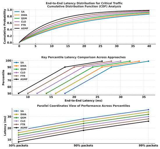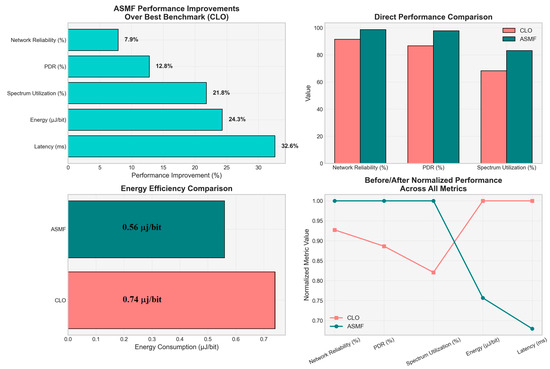In the industrial setting, ASMF demonstrated significant improvements compared with the best benchmark (CLO), as shown in Figure 9. The framework showed particular effectiveness in handling mixed traffic patterns, with a 32.6% reduction in latency, 12.8% increase in PDR, and 24.3% improvement in energy efficiency. Table 13 presents the results of an industrial IoT case study, showing that the ASMF approach outperforms CLO in all metrics, including a 32.6% reduction in latency, a 12.8% improvement in packet delivery ratio (PDR), and a 24.3% reduction in energy consumption per bit.