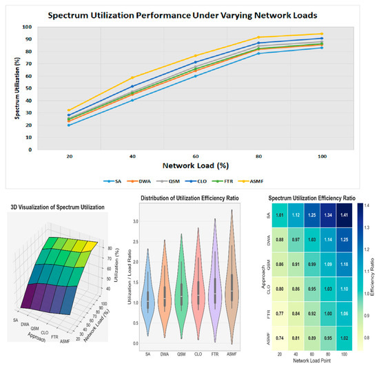 Figure 6 shows the spectrum utilization under varying network loads. ASMF consistently achieved higher utilization, with particularly significant improvements under low to moderate loads (20–60%). At 40% network load, ASMF achieved 58.7% spectrum utilization compared with 44.8–51.6% for benchmark approaches. Table 10 shows that the proposed ASMF approach consistently achieves the highest spectrum utilization across all network load levels, with notable improvements over existing methods, especially under low to moderate traffic.