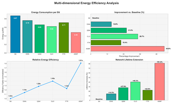 Figure 7 compares the energy consumption per successfully delivered bit. ASMF achieved the lowest energy consumption at 0.48 µJ/bit, representing a 22.6% improvement over the most energy-efficient benchmark (CLO at 0.62 µJ/bit). Table 11 presents the numerical values and improvement percentages of energy efficiency.