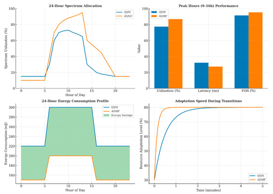 Figure 10 shows how ASMF adapted spectrum allocation throughout a 24-h period compared with QSM. ASMF demonstrated superior adaptation to predictable traffic patterns, reducing spectrum utilization during low-activity periods while rapidly scaling up resources during peak times. Table 14 presents key metrics from a smart building case study, highlighting that ASMF outperforms QSM in all measured parameters. Notable improvements include a 33.7% reduction in energy consumption during the night and a 56.3% faster adaptation speed during transition periods.