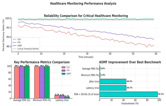 Figure 11 shows the reliability comparison for critical healthcare monitoring data. ASMF consistently maintained reliability above the 99.9% threshold required for critical healthcare applications, while benchmark approaches occasionally dropped below this critical level. Table 15 presents key performance metrics for this scenario.