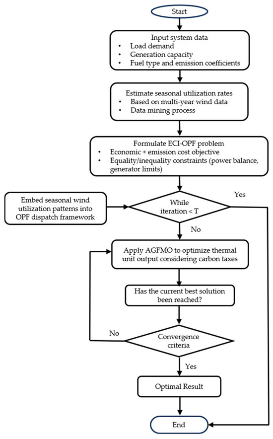 To enhance the clarity of the solution framework, an integrated flowchart is provided in Figure 1. This diagram illustrates the main procedural steps of the emission-constrained OPF model, highlighting its integration with the wind utilization prediction module developed in Section 2. Specifically, the forecasted wind availability is treated as a constraint within the OPF formulation. The AGFMO algorithm employs the dispatch of fossil-fuel generators, taking into account both fuel costs and carbon taxation schemes. The resulting outputs include optimal power generation schedules and associated carbon cost metrics. This integration enables a practical low-carbon dispatch strategy suited to policy-constrained energy systems to be developed.