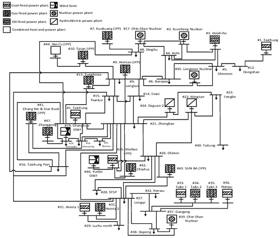 where N represents the total number of generators in the system, while Pk denotes the power output of the k-th generator. The cost structure includes several components: a k refers to the fixed cost associated with operating the k-th generator, bk is the linear fuel cost coefficient that indicates how fuel costs increase proportionally with the power output, and ck captures the quadratic fuel cost coefficient, accounting for the non-linear increase in fuel consumption as the generator output increases. On the emissions side, λ C O 2 represents a flat-rate carbon cost per ton of CO2, which, when combined with generator-specific emission factors, determines the total emission-related cost. This modeling approach reflects a fixed carbon tax scenario, in line with Taiwan’s current situation where no official carbon pricing mechanism has been implemented, and policy development remains in discussion. The inclusion of λ C O 2 within the objective function enables direct incorporation of carbon-related penalties into dispatch optimization. Specifically, αk represents the fixed carbon emissions from the k-th generator, while the linear and quadratic components of carbon emissions are described by βk and γk, respectively, reflecting how emissions vary with power output.