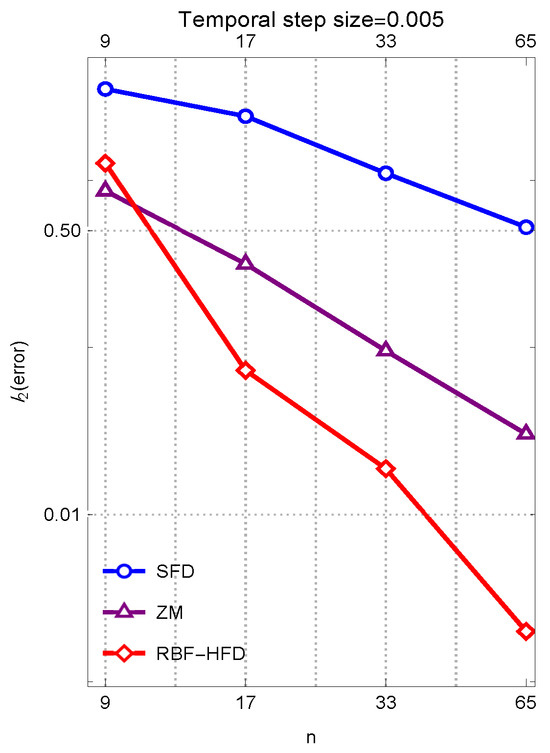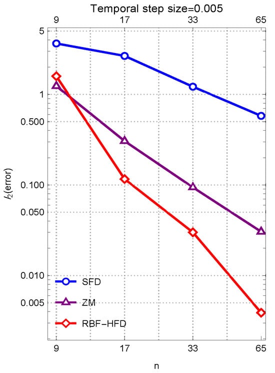 The proposed method using RBF-HFD in space is called RK6, and the standard first-order FD method and the recent efficient method in [29] are named SFD and ZM, respectively. Note that to have fair comparisons, RK6 is used for all the compared solvers using a fixed temporal step size .